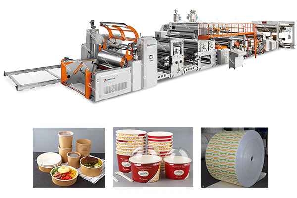 WSFM型淋膜機(jī)是一款綠色環(huán)保機(jī)型,其工藝原理是塑料粒子(PE/PLA/PBS/EVA等)經(jīng)螺桿塑化后由平模頭??诔删€型擠出,拉伸后附著于紙張表面, 經(jīng)冷卻定型壓合后,使紙張具有防水防油防滲,熱封等功能